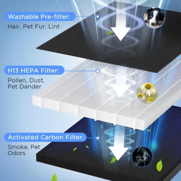 • WASHABLE FILTER: Equipped with a high-efficiency 3-stage filtration system, the air cleaner for pets can effectively filter airborne particles as small as 0.3 microns, such as pollen, dust, and pet dander. Cleaning the pre-filter with water or a vacuum cleaner will help extend the life of the filter. More activated carbon pellets help absorb a bad odor such as pet odors, fumes and VOCs