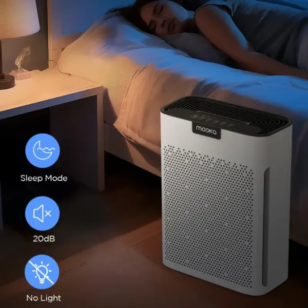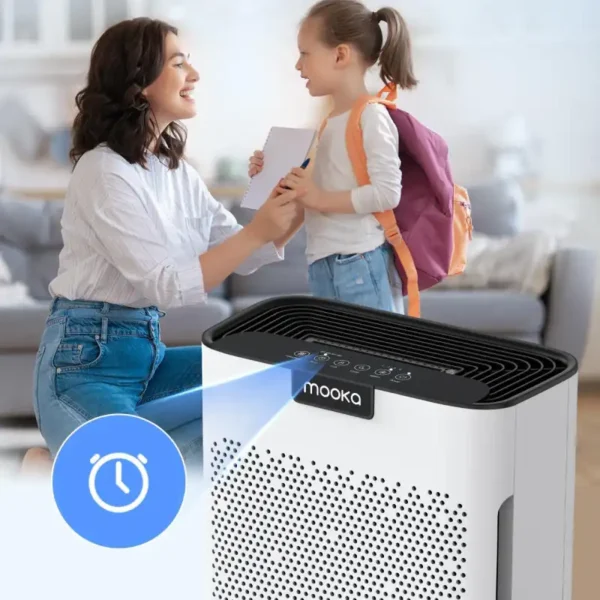 • FILTER REPLACEMENT REMINDER: This air purifier with washable filter has a filter change reminder function. When the filter reaches the end of its service life, the filter indicator lights up to remind you to replace the filter. You can also clean the pre-filter to extend the its service life. After installing the filter, press and hold the filter button for 3 seconds until you hear a beep to reset the filter reminder. Purchase MOOKA official replacement filter on Amazon to keep the optimal purification effect