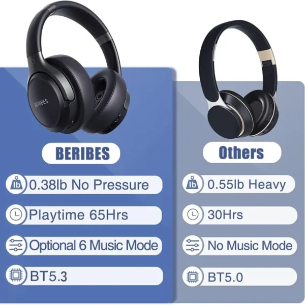 - Optional 6 Music Modes: Adopted most advanced dual 40mm dynamic sound unit and 6 EQ modes, BERIBES updated headphones wireless bluetooth black were born for audiophiles. Simply switch the headphone between balanced sound, extra powerful bass and mid treble enhancement modes. No matter you prefer rock, Jazz, Rhythm & Blues or classic music, BERIBES has always been committed to providing our customers with good sound quality as the focal point of our engineering.