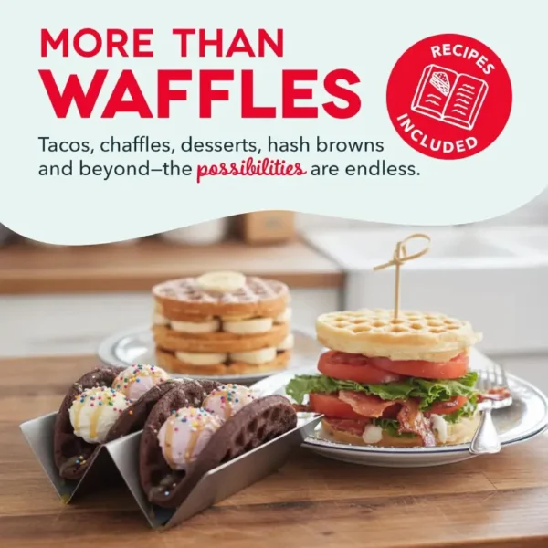 - MORE THAN WAFFLES: Make your favorite breakfast classics, or get creative with waffled hash browns, cookies and even biscuit pizzas. Any batter will “waffle” into single serving portions. Great for families or on the go.