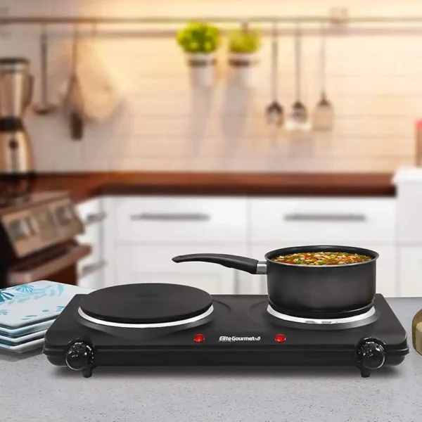The Elite Gourmet EDB-302BF is a powerful and portable double cast iron burner, perfect for cooking, warming, or entertaining in any space. With 1500 watts of power, independent temperature controls, and durable cast iron plates, it delivers consistent heating for all your cooking needs. Compact and easy to clean, this electric hot plate is ideal for dorms, offices, camping, or as an extra cooking surface at home.