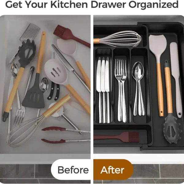 - 【Adjustable Size】:The width of the utensil drawer organizer expands from 12.4″ to 21″, perfectly fitting most standard drawers. (Measure your drawer before buying for the best fit).