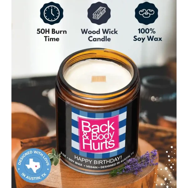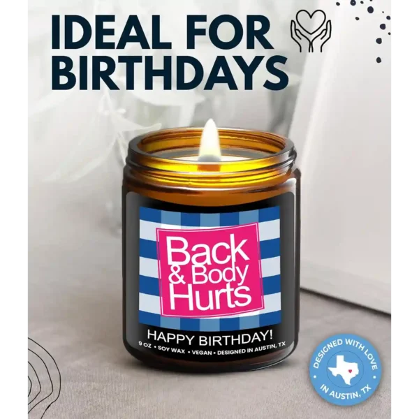Celebrate milestone birthdays with laughter and a touch of relaxation with this Funny Happy Birthday Candle. A unique gift idea for men and women turning 30, 40, 50, 60, or beyond, this candle features a witty “Back & Body Hurts” design that’s sure to get a smile. With a long-lasting scent and gift-ready packaging, it’s the perfect blend of humor and practicality for birthday celebrations.