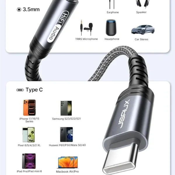 - 【Wide Compatibility】: JSAUX USB C headphone adapter compatible with most of the type c devices: for iPhone 17 iPhone 17 Air iPhone 17 Pro iPhone 17 Pro Max, for iPhone 16 16 Plus 16 Pro 16 Pro Max, for iPhone 15 15 Plus 15 Pro 15 Pro Max, for Samsung Galaxy S24/S24+/S24 Ultra, S23 S23+ S23 Ultra, S22 S22+ S22 Ultra, S21 S21+ S21 Ultra, S20 Ultra S20 Z Flip S20+ S10 S9 S8 Plus, Note 20 10 10+ 9 8, for iPad Pro, iPad mini 6, MacBook, for Pixel 9 8 7 6, for Huawei Mate 60 50 40 30 20 10 and Pro, P60 P50 P40 P30 P20 and Pro, for OnePlus 6T 7 7Pro, and more