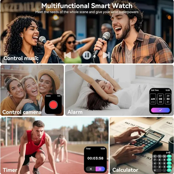 - Smart Life Connectivity Center: Bluetooth 5.3 technology ensures stable call connections, allowing you to directly view phone notifications and control music playback. Supports message notifications from major social apps like Facebook and Instagram, allowing you to see important information by simply raising your wrist. Remote camera control makes framing group photos easier, eliminating the need for help taking travel selfies(Unable to reply to message)