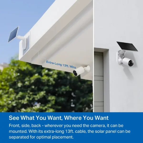 - 【Easy Wire-Free Installation – Install Anywhere】Enjoy the flexibility of wire-free installation with the Tapo SolarCam C402 KIT. Free from outlet limitations, you can effortlessly set up the camera and solar panel wherever you need—whether it’s the front porch, backyard, garage, or even a remote shed. The innovative design allows for the camera and solar panel to be installed as a unified unit or separately using the included 13-foot cable, providing optimal placement for any scenario.