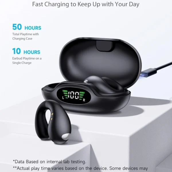- 👍𝗟𝗢𝗡𝗚 𝗕𝗔𝗧𝗧𝗘𝗥𝗬 𝗟𝗜𝗙𝗘 𝗪𝗜𝗧𝗛 𝗤𝗨𝗜𝗖𝗞 𝗖𝗛𝗔𝗥𝗚𝗘 — Enjoy up to 10 hours of continuous playtime on a single charge and an additional 40 hours with the charging case. These clip on ear buds also feature fast charging—just 5 minutes of charge provides 1 hour of playback. Stay powered throughout your day with these efficient clip on headphones.