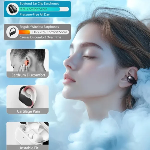- 👍𝗜𝗠𝗠𝗘𝗥𝗦𝗜𝗩𝗘 𝗔𝗨𝗗𝗜𝗢 𝗪𝗜𝗧𝗛 𝗢𝗣𝗘𝗡 𝗗𝗘𝗦𝗜𝗚𝗡 — Stay connected to your surroundings while enjoying clear, rich sound with these open ear headphones. The open ear earbuds design promotes ventilation and reduces discomfort during extended use, making them perfect for activities like hiking, traveling, or exercising. These clip on earbuds offer unparalleled comfort and performance for any occasion.